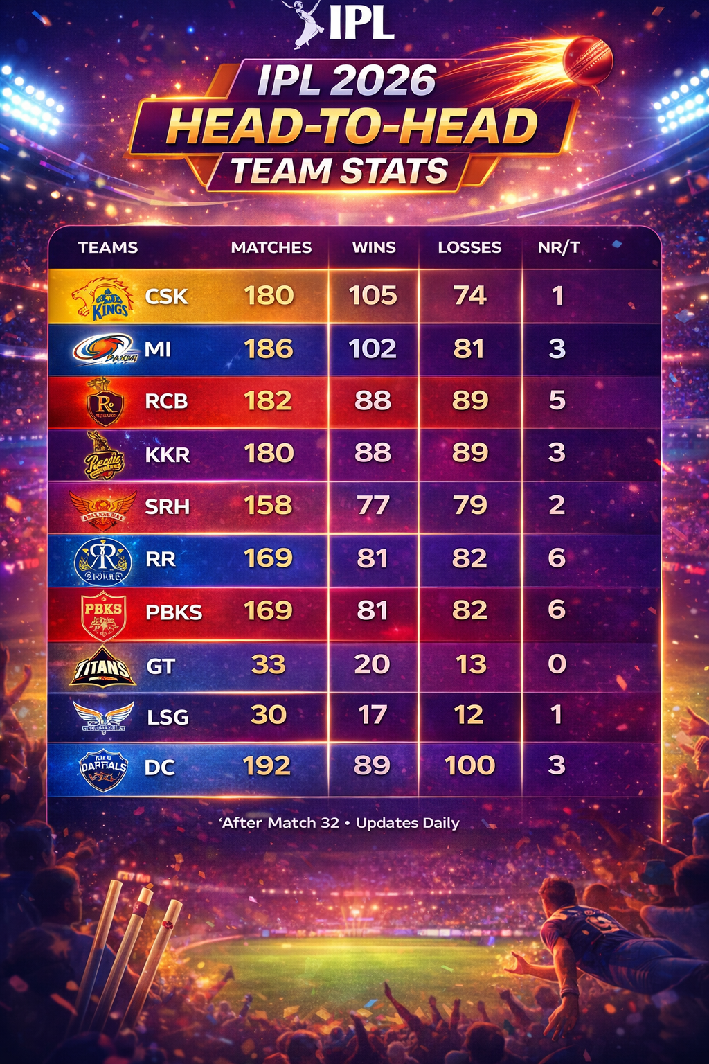 | CSK | KKR | 32 | 20 | 11 | 1 |